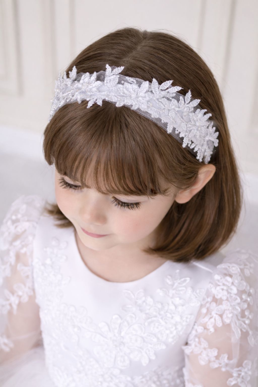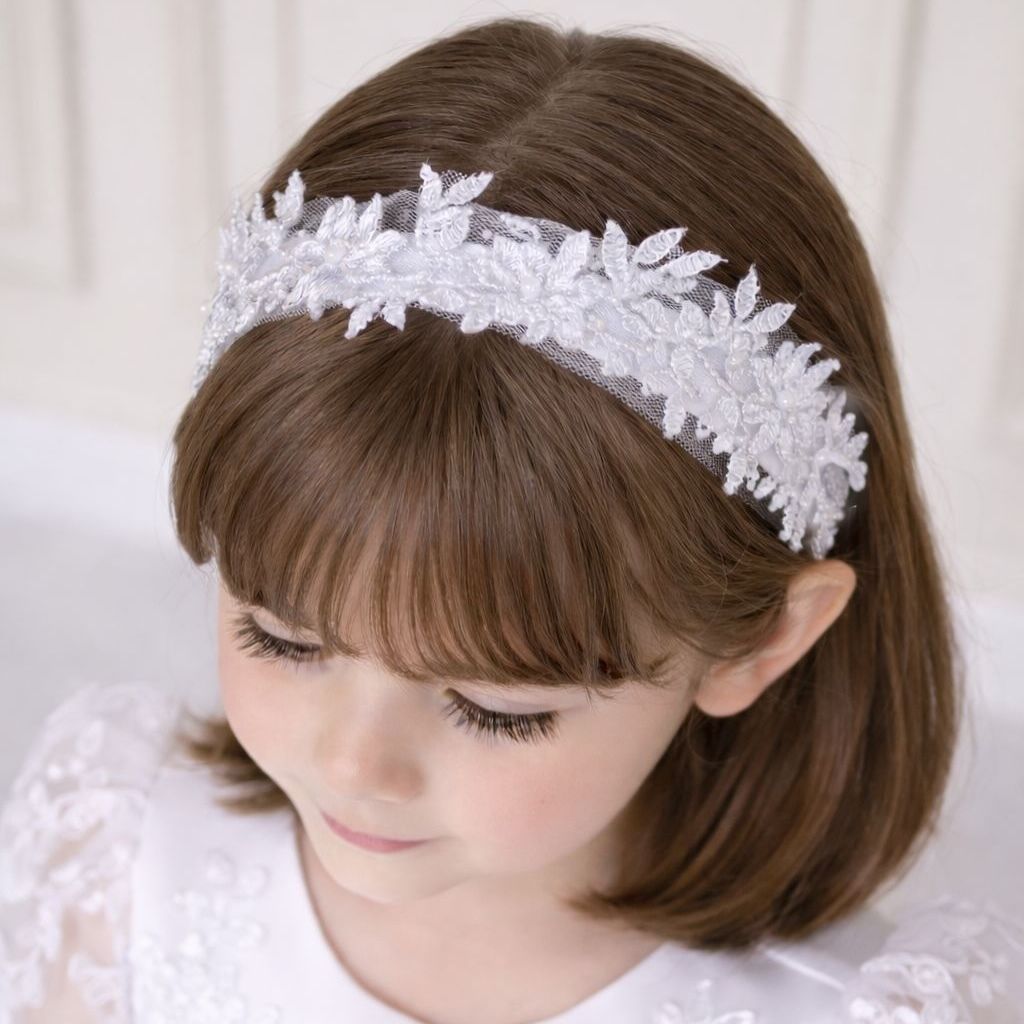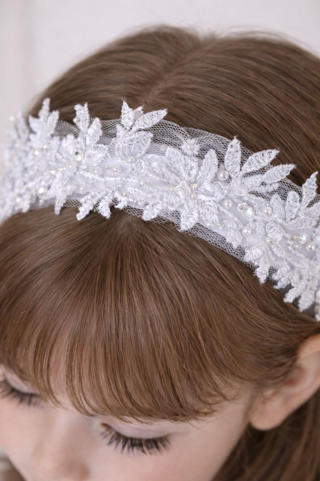 Ozdoba do vlasov pre malú princeznú tvorená tylom, saténom a perličkami.