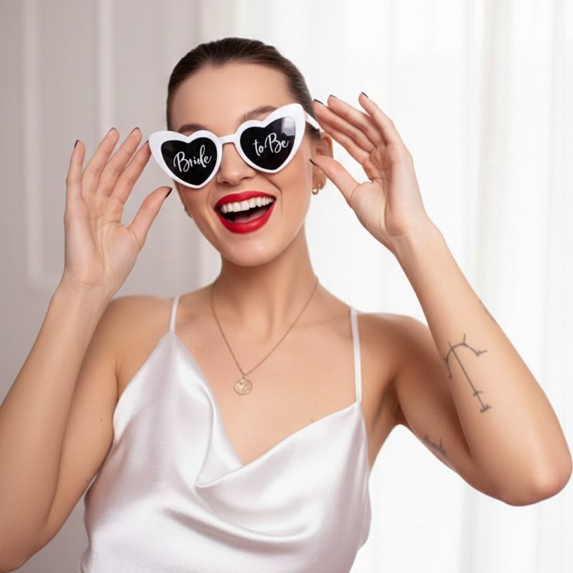 Okuliare v tvare srdca s nápisom "Bride to Be" v bielej farbe s čiernymi sklami. Okuliare sú tiež pekným darčekom na rozlúčku so slobodou.