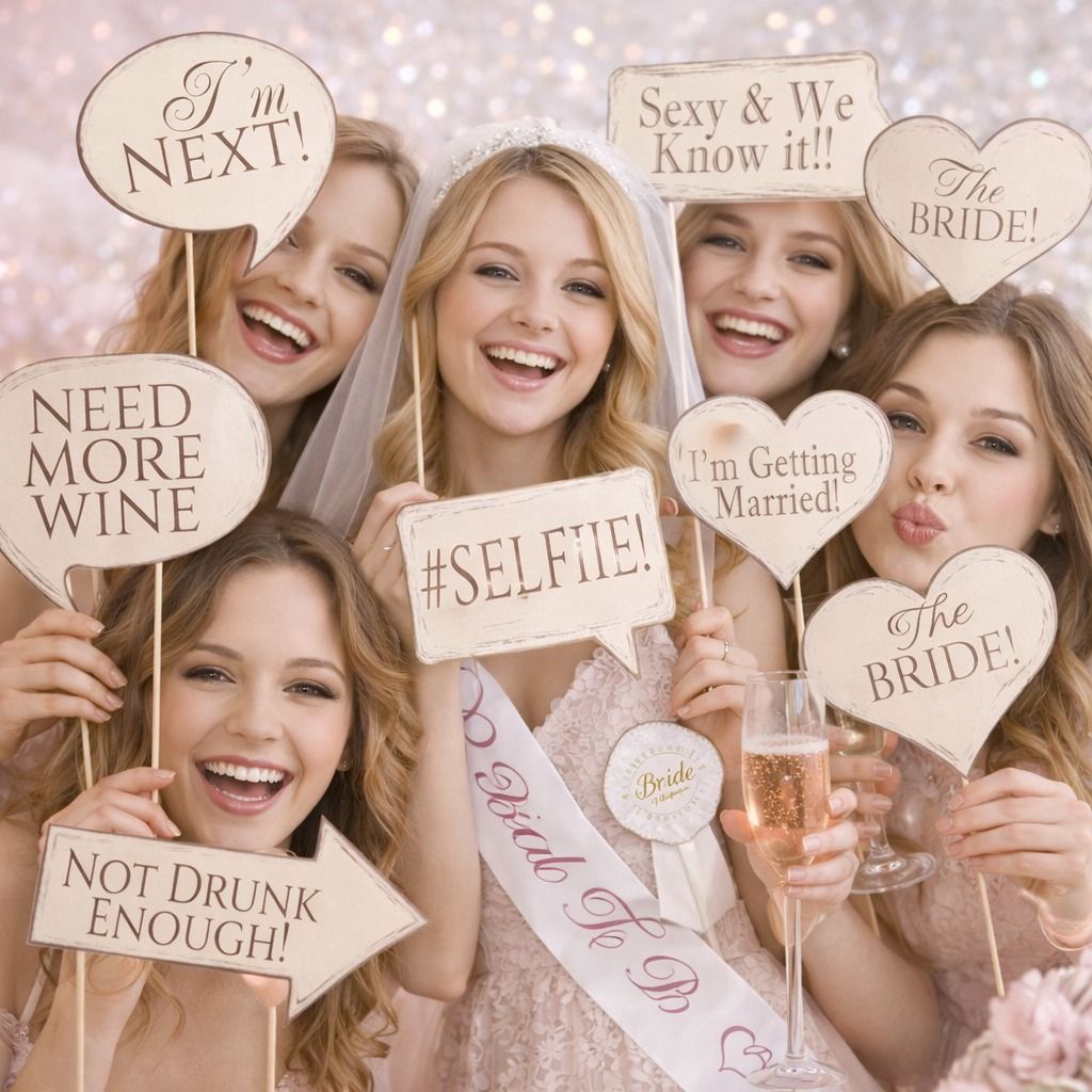 Dodajte svojim svadobným fotografiám poriadnu dávku zábavy s našimi svadobnými rekvizitami na fotenie. Tento set vtipných nápisov, okuliarov, pier či fúzov na paličke okamžite prelomí ľady v každom fotokútiku a zabaví hostí všetkých vekových kategórií. Rekvizity sú vyrobené z pevného kartónu a vďaka praktickému držaniu sú ideálne pre rýchle pózovanie pred objektívom. Či už plánujete elegantné fotenie alebo bláznivú párty, tieto drobnosti zaručia, že vaše svadobné momentky budú plné smiechu a originálnych spomienok.