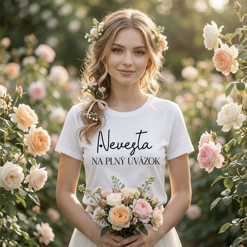 Biele tričko pre nevestu s vlastným textom. Tričko si môžete prispôsobiť ľubovoľným textom a bude tak perfektným darčekom pre nevestu alebo na rozlúčku so slobodu. K tričku pre nevestu si môžete zladiť aj tričká pre družičky, svedkyňu alebo svadobnú mamu.