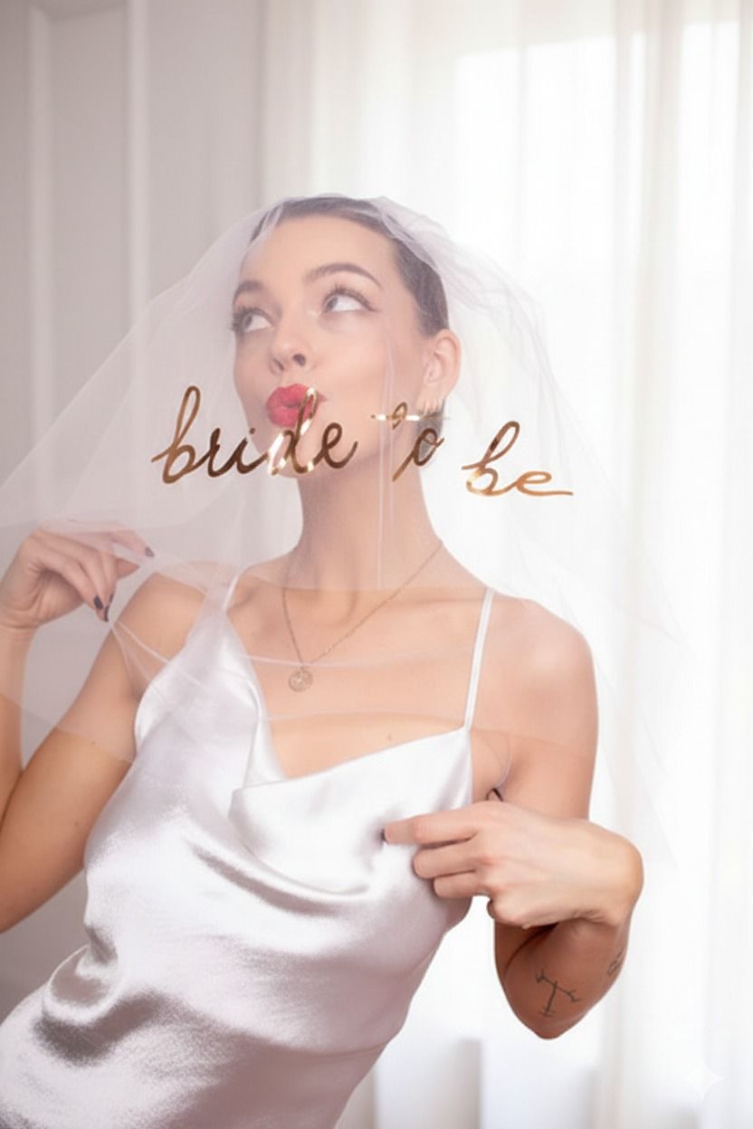 Biely závoj s ružovo-zlatým nápisom „Bride to Be“. Závoj je ukončený hrebienkom.