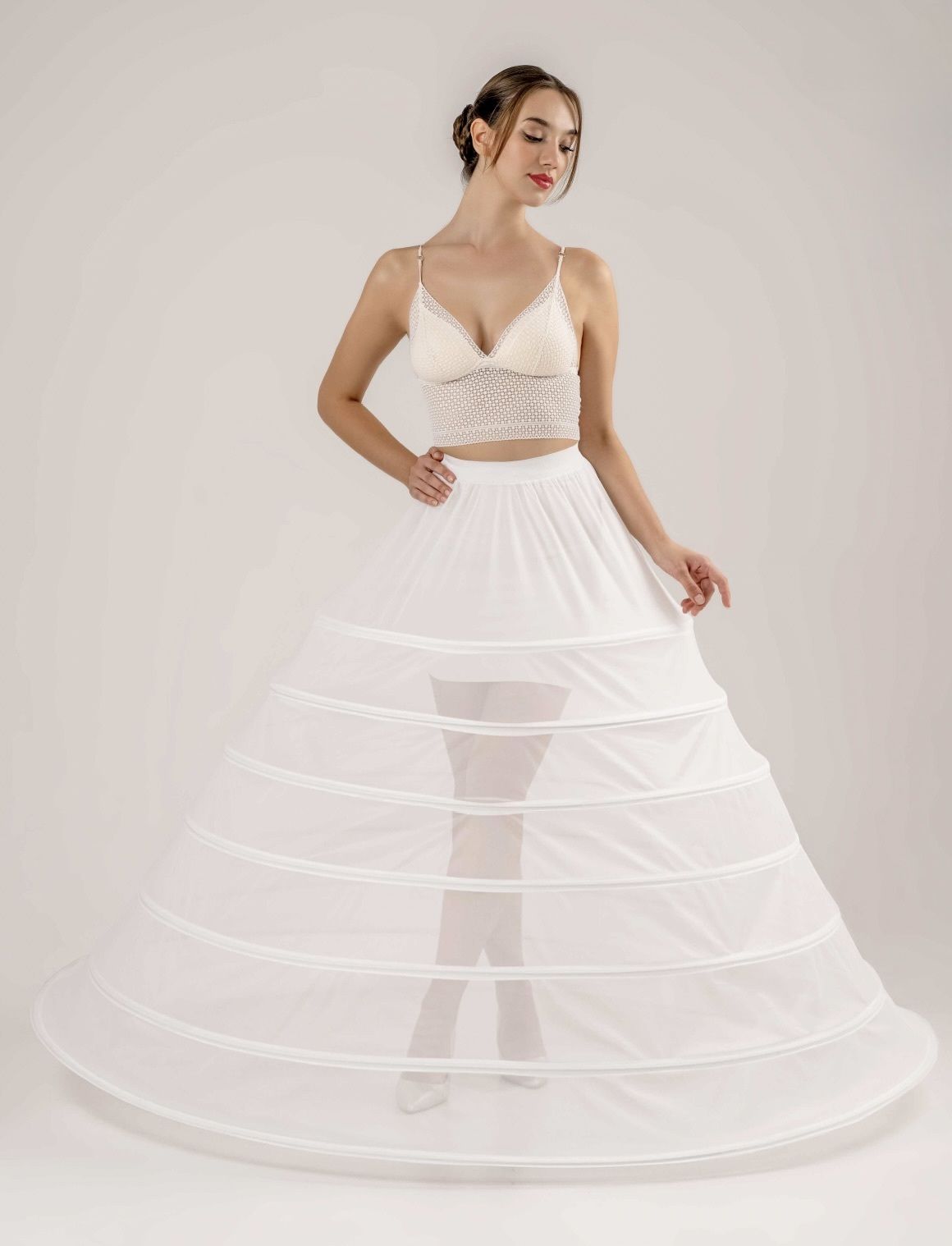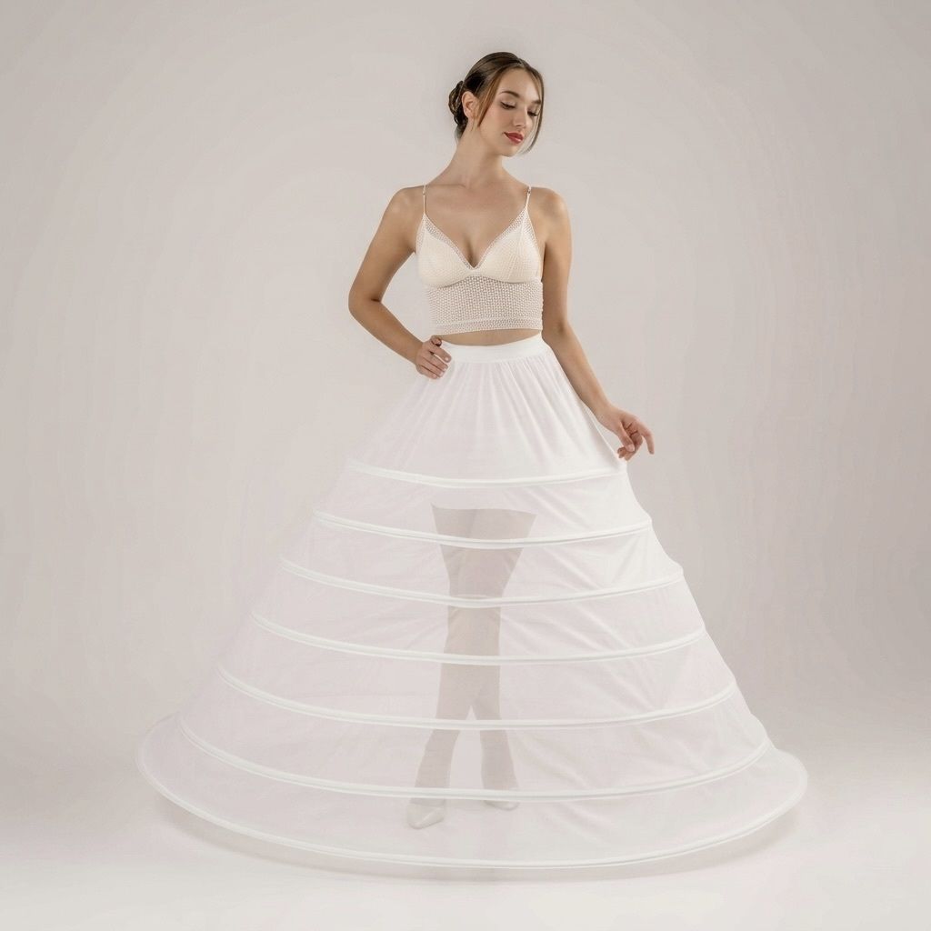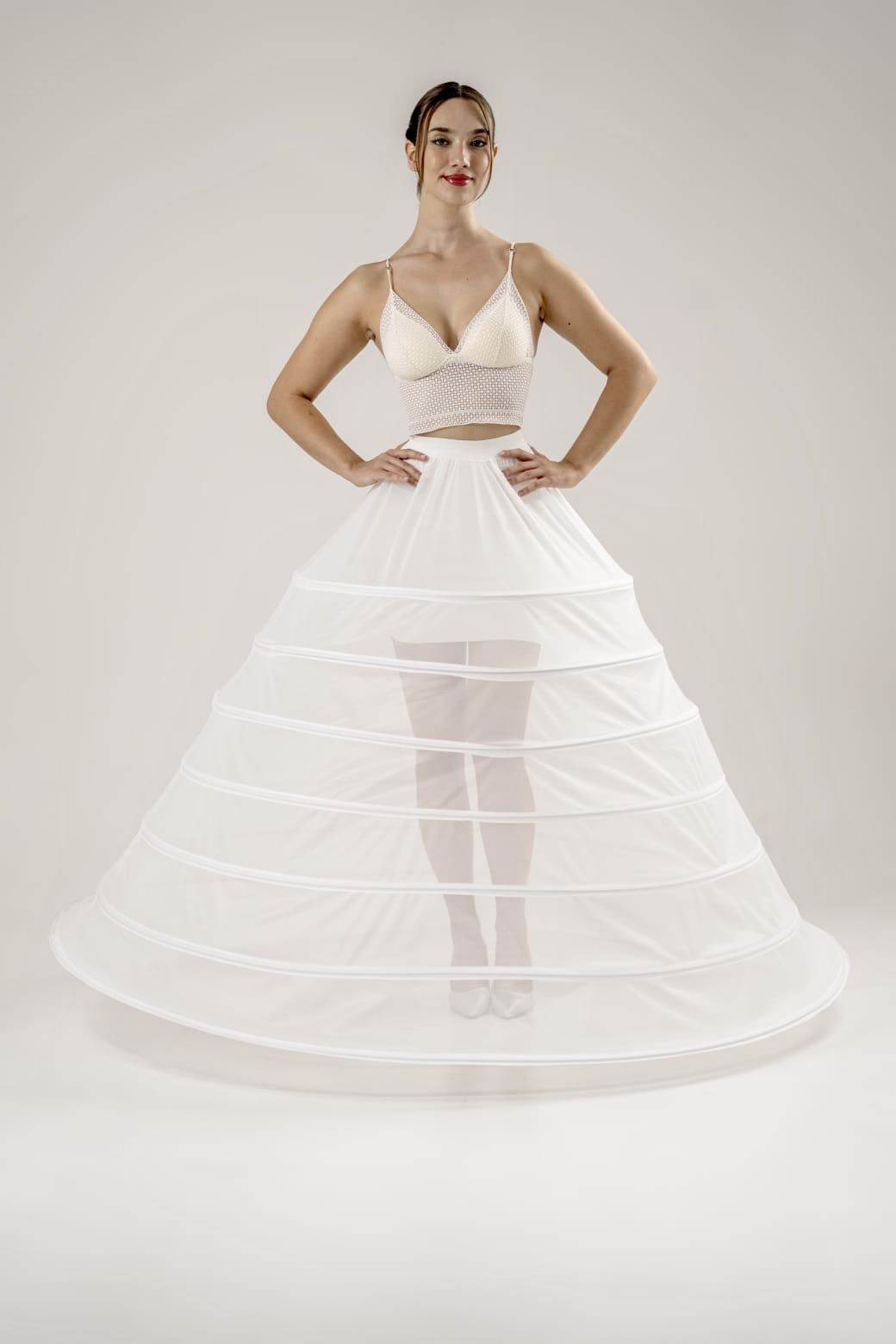 Tento model je ideálny pre šaty typu "Cinderella" s extrémnym množstvom vrstiev tylu, ktoré potrebujú silnú konštrukciu, aby nesplývali. Sedem kruhov zabezpečuje plynulý prechod objemu a vytvára dokonalý tvar zvona, ktorý budí pozornosť na každom kroku.