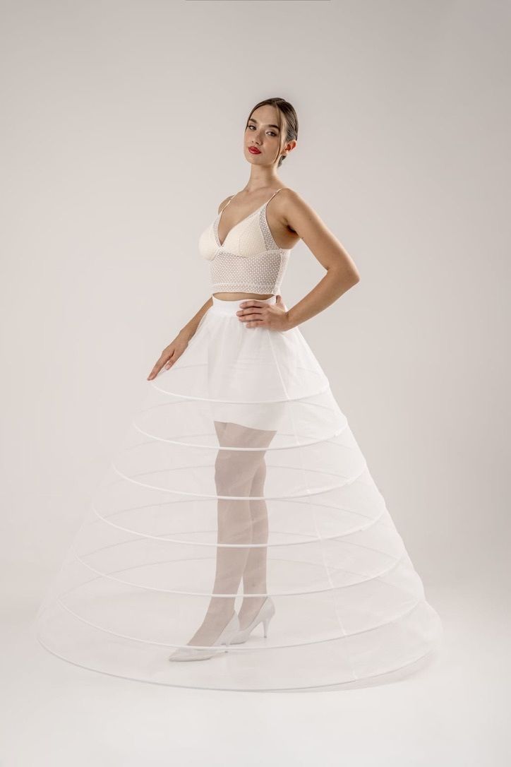 Svadobná spodnička 460 je určená pre nevesty, ktoré sa neboja vystúpiť z davu a túžia po ohromujúcom objeme. So siedmimi pevnými obručami a obvodom až 460 cm premení akékoľvek svadobné šaty na skutočnú kráľovskú róbu.
