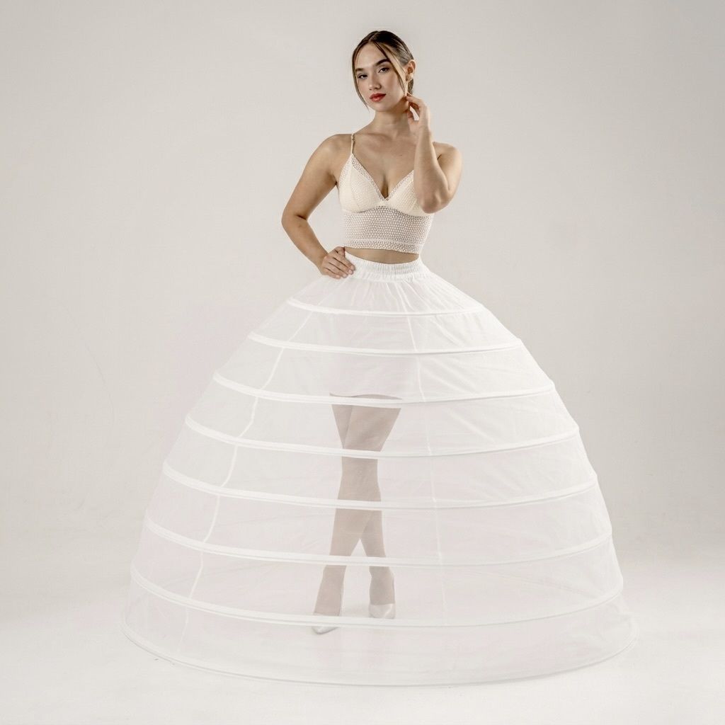 Vďaka precíznemu rozostupu 8 kruhov je objem rovnomerne rozložený od bokov až po zem, čo vytvára ikonickú siluetu kráľovskej princeznej.