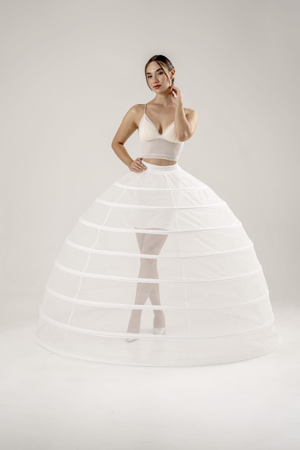 Model 490 je skutočným gigantom medzi spodničkami. S impozantným obvodom 490 cm a ôsmimi pevnými oceľovými obručami poskytuje nekompromisnú oporu pre tie najväčšie a najťažšie svadobné róby. Ak majú vaše šaty masívnu vlečku alebo desiatky vrstiev látky, toto je jediný model, ktorý zaručí, že si šaty udržia dokonalý tvar kupoly po celú noc.