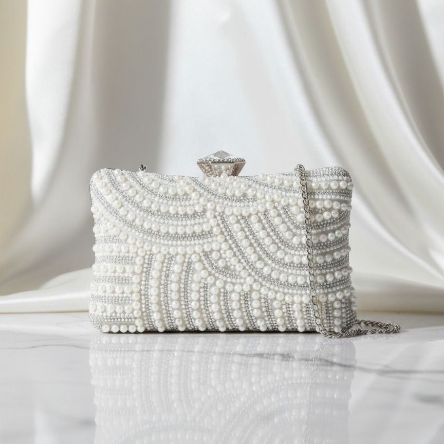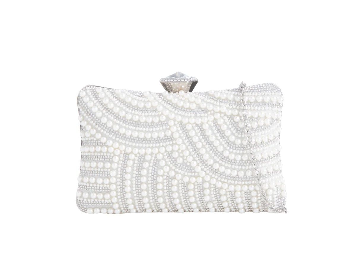 Clutch kabelka zdobená perličkami v bielej farbe.