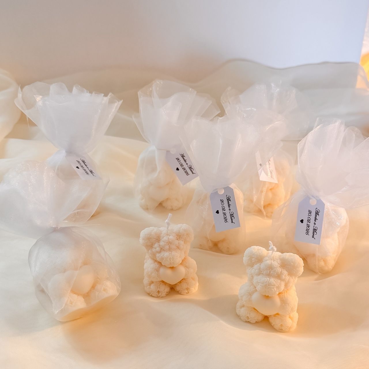 Obdarujte svojich hostí jedinečným darčekom v podobe prírodnej sójovej sviečky. Sviečka je zabalená v transparentnom tyle s mašličkou a papierovým štítkom. Farbu stuhy, text na štítok, farbu textu a typ písma uveďte na konci objednávky v poznámke.