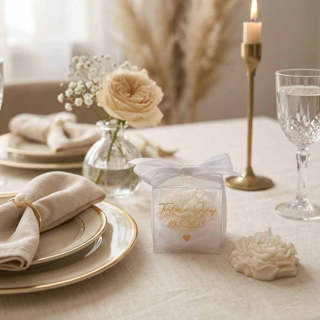 Tento darček pre svadobných hostí v podobe sójovej sviečky je prejavom vďaky, ktorý doslova rozžiari domovy vašich blízkych. Ručne odlievaný prírodný vosk v elegantnom balení s vašimi menami a dátumom svadby je nielen štýlovým doplnkom svadobného stola, ale aj trvácnou spomienkou na váš svadobný deň. Vďaka čistému horeniu sójového vosku a jemnej vôni je to darček, ktorý si hostia skutočne vychutnajú.