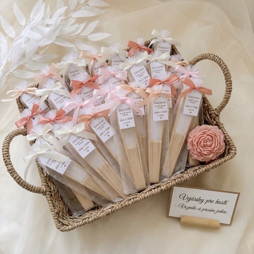 Vejáre sú v organzovom vrecku ozdobené stuhou a štítkom. Na štítok je možné napísať ľubovoľný text.