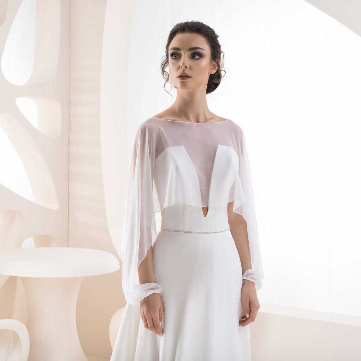 Kvalitné svadobné bolerko pre nevestu. Je vyrobené z jemného tylu. Môže slúžiť napríklad na jemné prekrytie šiat v kostole.