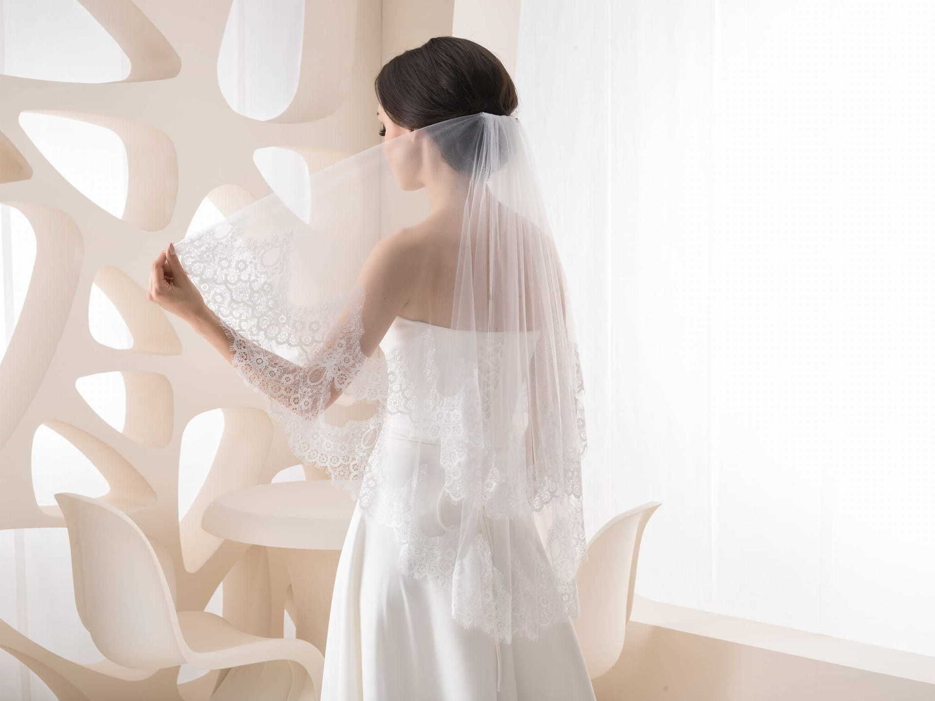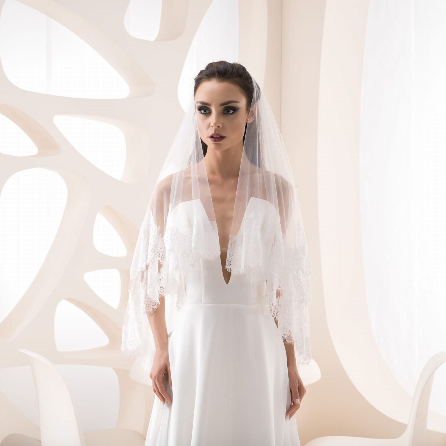 Jemný a elegantný svadobný závoj pre nevestu. Závoj je zdobený čipkou a skladá sa z dvoch vrstiev. Závoj je ukončený hrebienkom. Krásne splýva, je z mäkkého, kvalitného tylu.