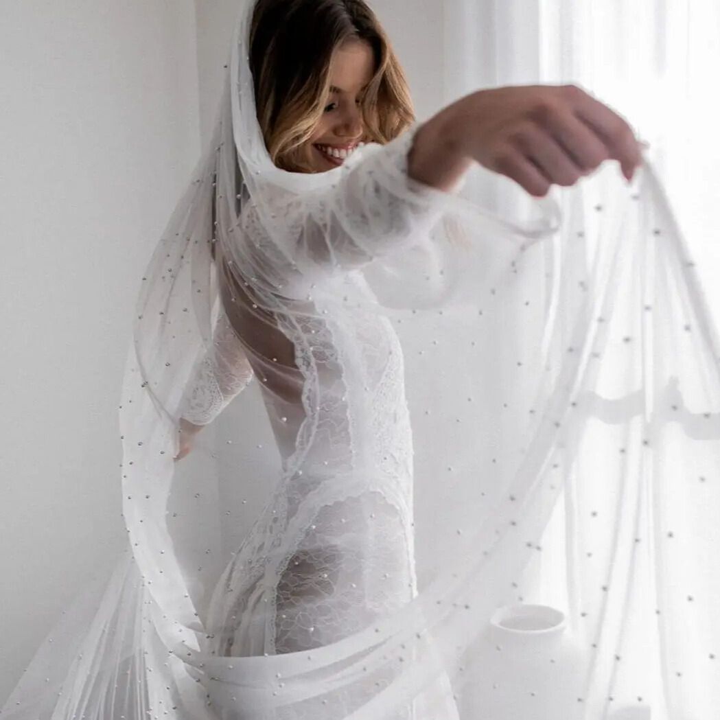 Jemný a elegantný svadobný závoj pre nevestu. Závoj je zdobený jemnými perličkami, na vrchu je hrebienok. Krásne splýva, je z mäkkého tylu.
