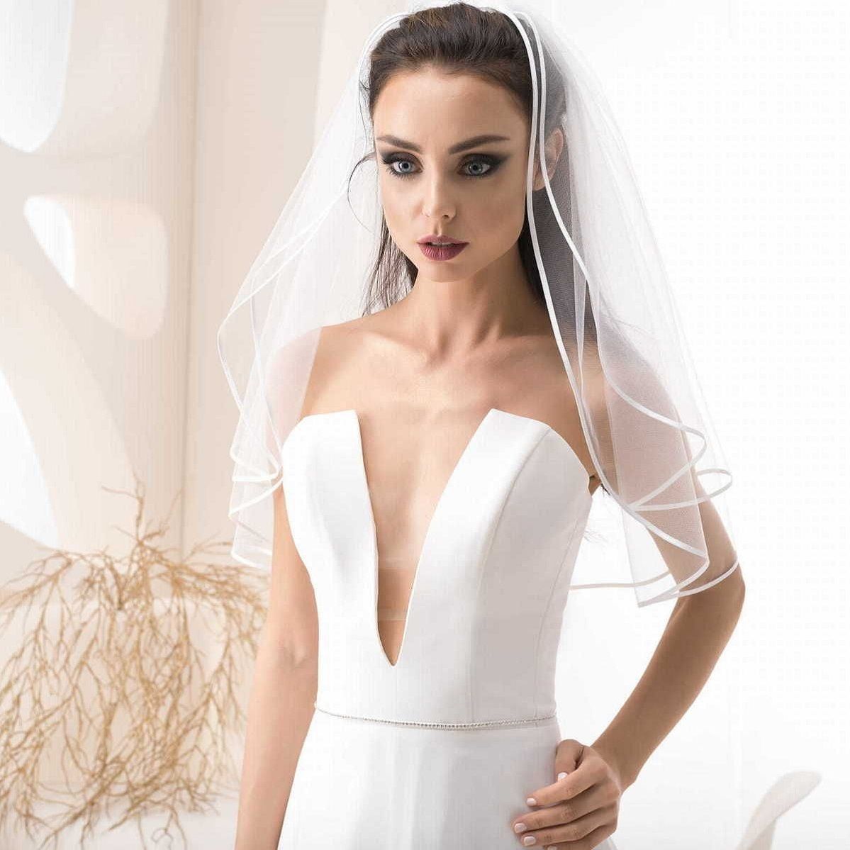 Jemný a elegantný svadobný závoj pre nevestu. Závoj je zdobený tenkým lemom. Skladá sa z dvoch vrstiev. Závoj je ukončený hrebienkom. Krásne splýva, je z mäkkého, kvalitného tylu.