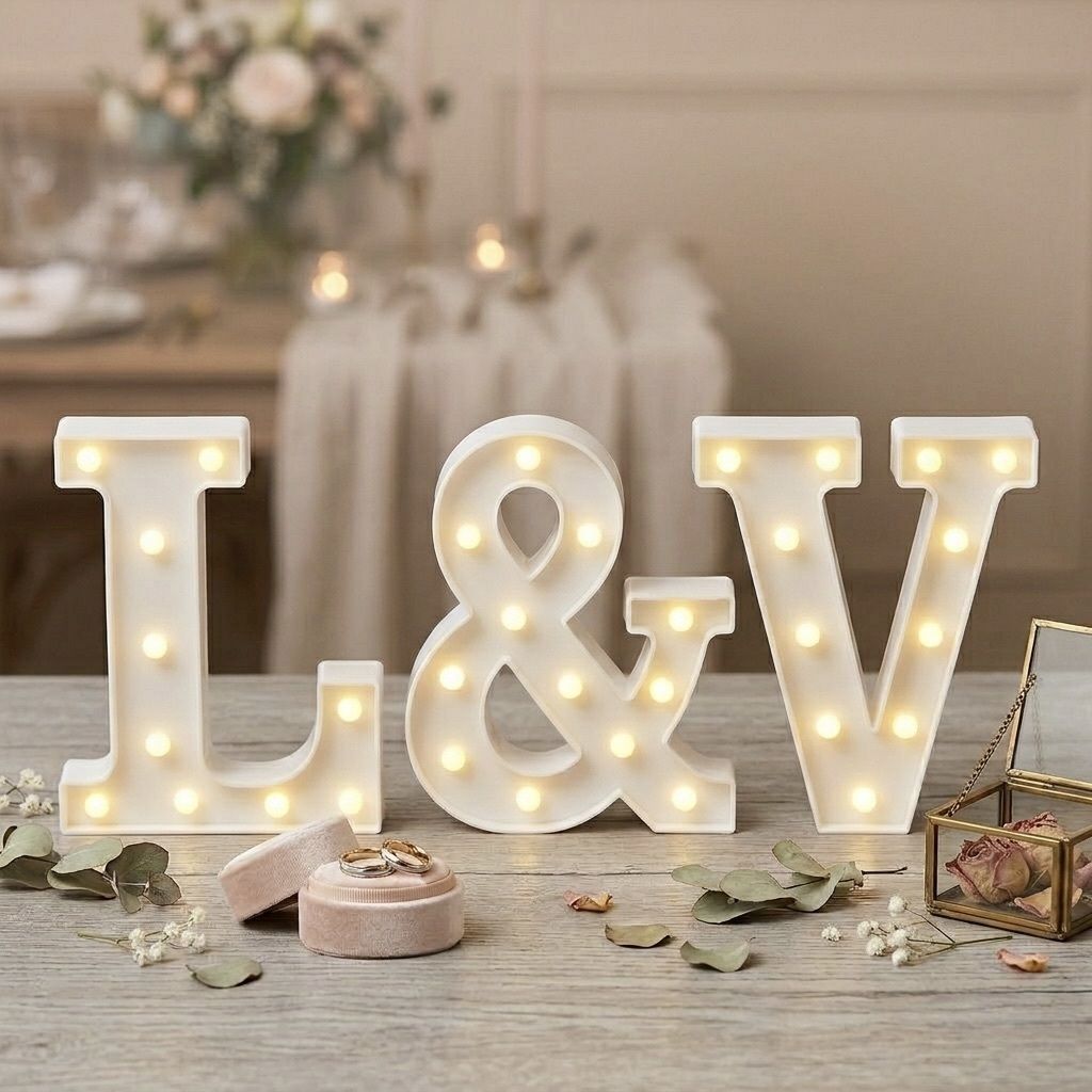 Zo svietiacich led písmen si môžete vytvoriť akýkoľvek text alebo Vaše iniciálky - A&B. K dispozícii je celá abeceda, symbol & a tiež biele, červené alebo ružové srdičko.