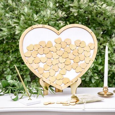 Netradičná drevená svadobná kniha pre hostí v tvare srdca so 70 kusmi prírodných drevených sŕdc, na ktoré sa píšu odkazy pre mladomanželov. Rámček je v prírodnej farbe a v prednej časti sa nachádza sklo. Súčasťou balenia je i stojan.