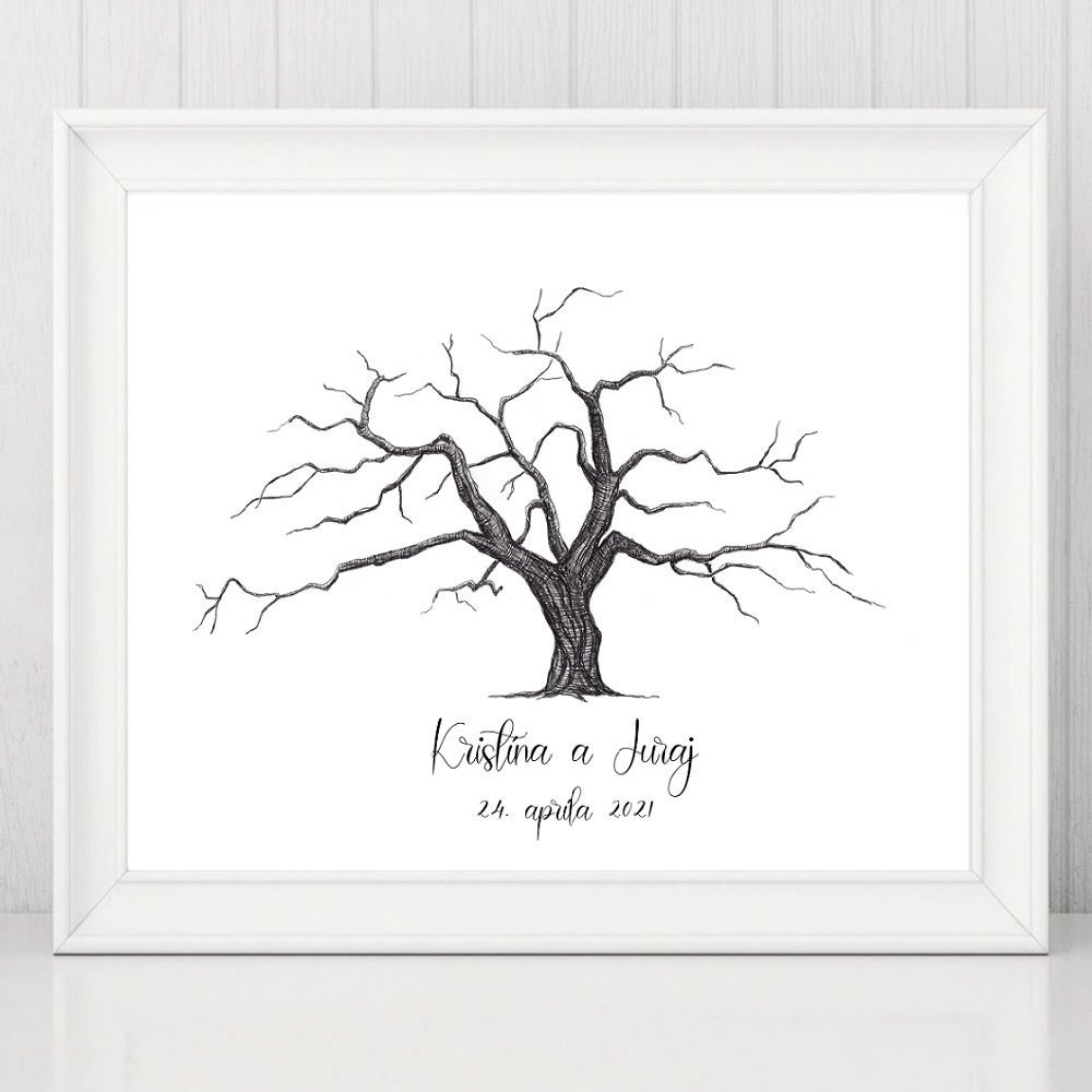 Použitie: Namočte prst do pečiatkovej podložky a odtlačte prst na papier so stromom. Následne nechajte preschnúť a zasklite. Plagát môžete využiť aj na venovania od svadobných hostí, ktoré na plagát jednoducho napíšu.