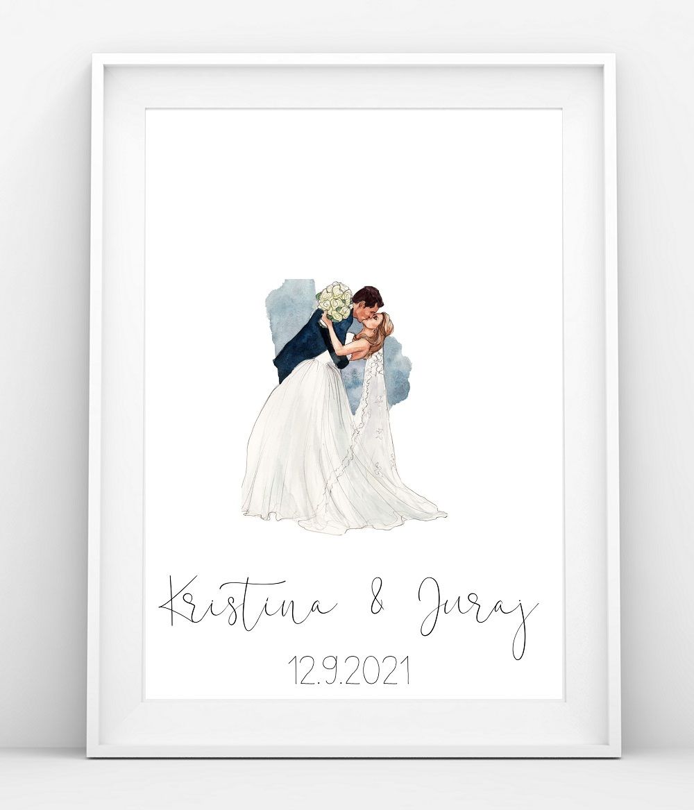Tento krásny svadobný obraz v podobe svadobného obrazu jednoducho musíte mať! Najkrajšia pamiatka na Váš veľký deň. Obraz je personalizovaný - s Vašimi menami, p.p. dátumom Vašej svadby. Obraz je tlačený ako plagát v rozmeroch šírka 30cm a výška 40cm na kvalitný matný papier v kvalite 200g.