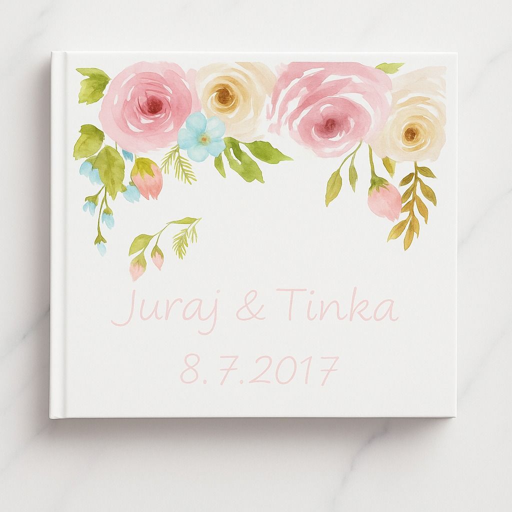 Jemná svadobná kniha hostí s pevným obalom a s vlastným textom. Na knihu hostí je možné napísať ľubovoľný text, napríklad mená, dátum svadby, slová svadobná kniha a iné.