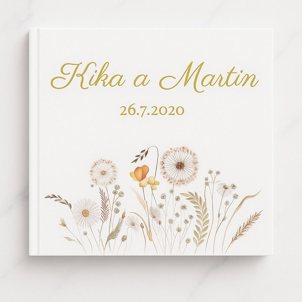 Jemná svadobná kniha hostí s pevným obalom a s vlastným textom. Na knihu hostí je možné napísať ľubovoľný text, napríklad mená, dátum svadby, slová svadobná kniha a iné.