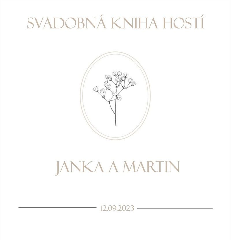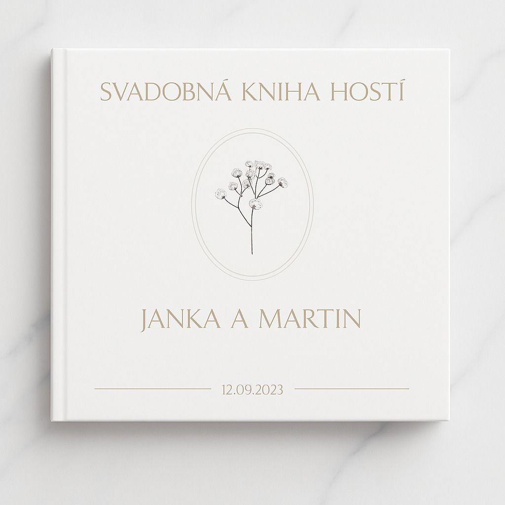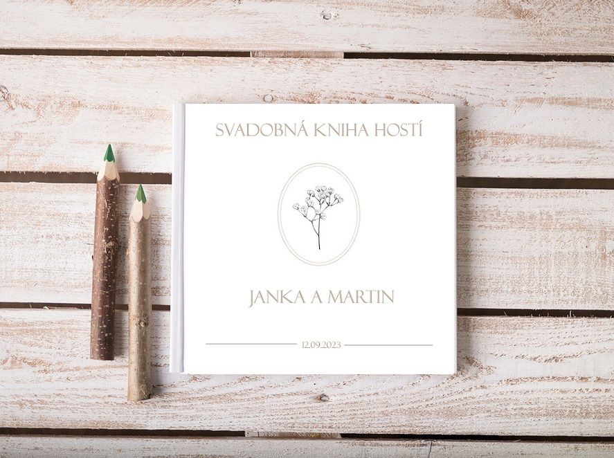 Jemná svadobná kniha hostí s pevným obalom a s vlastným textom. Na knihu hostí je možné napísať ľubovoľný text, napríklad mená, dátum svadby, slová svadobná kniha a iné.