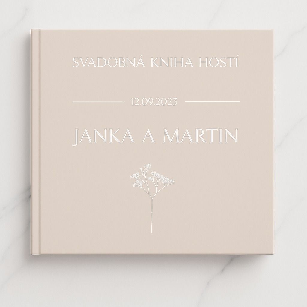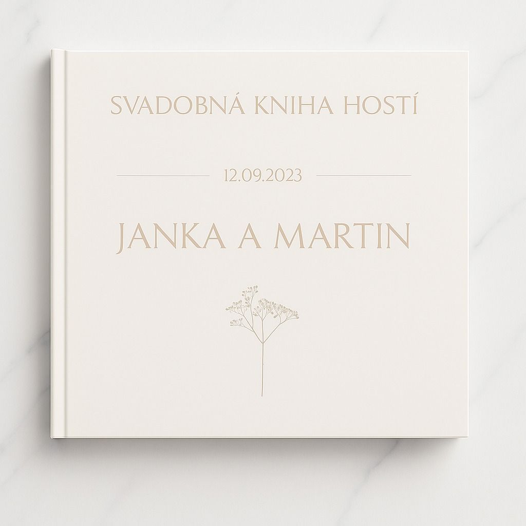 Jemná svadobná kniha hostí s pevným obalom a s vlastným textom. Na knihu hostí je možné napísať ľubovoľný text, napríklad mená, dátum svadby, slová svadobná kniha a iné.