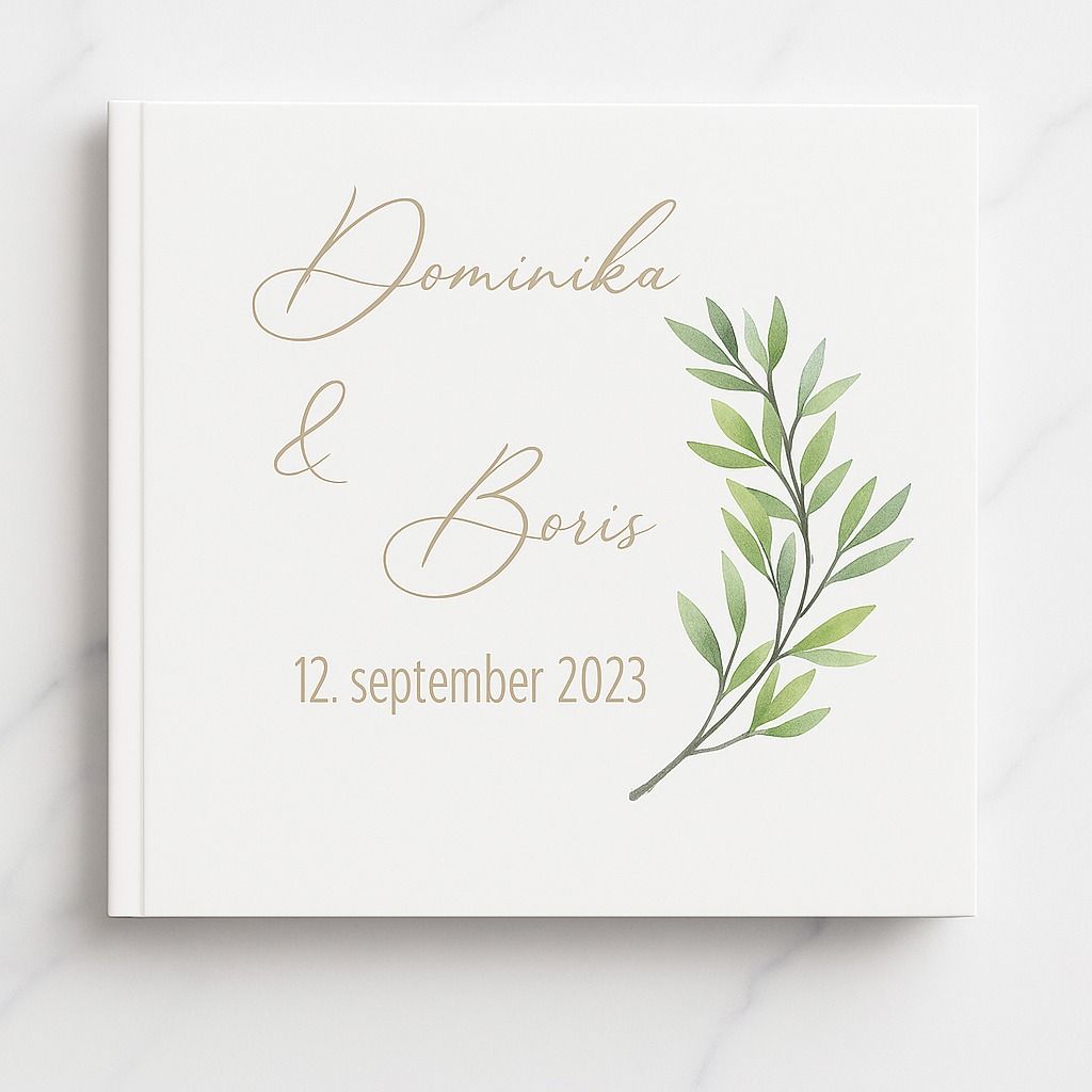 Jemná svadobná kniha hostí s pevným obalom a s vlastným textom. Na knihu hostí je možné napísať ľubovoľný text, napríklad mená, dátum svadby, slová svadobná kniha a iné.