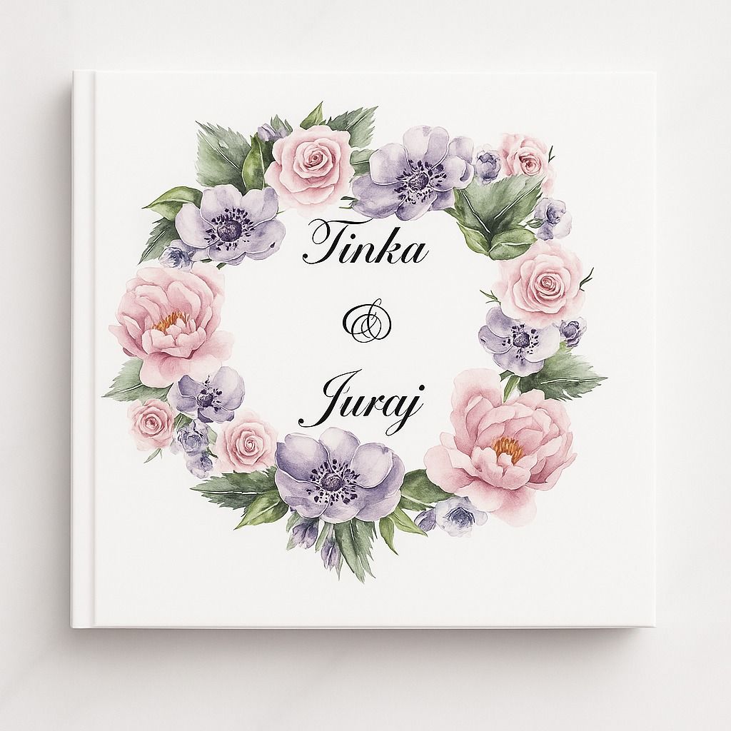 Jemná svadobná kniha hostí s pevným obalom a s vlastným textom. Na knihu hostí je možné napísať ľubovoľný text, napríklad mená, dátum svadby, slová svadobná kniha a iné.