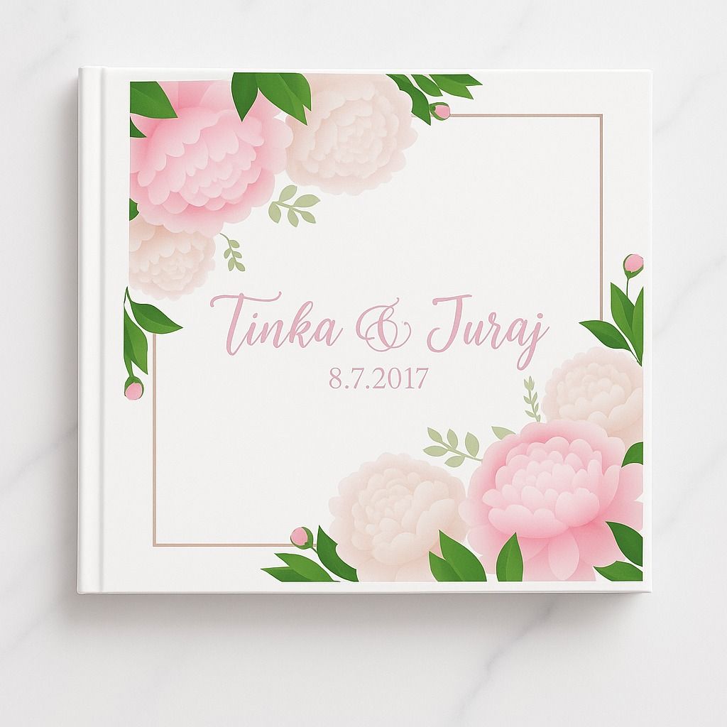 Jemná svadobná kniha hostí s pevným obalom a s vlastným textom. Na knihu hostí je možné napísať ľubovoľný text, napríklad mená, dátum svadby, slová svadobná kniha a iné.