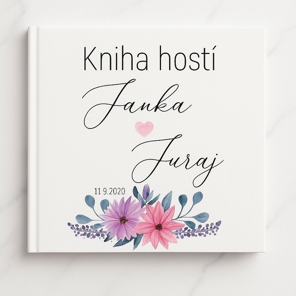 Jemná svadobná kniha hostí s pevným obalom a s vlastným textom. Na knihu hostí je možné napísať ľubovoľný text, napríklad mená, dátum svadby, slová svadobná kniha a iné.