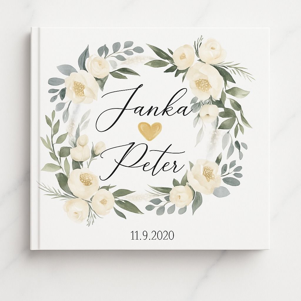 Jemná svadobná kniha hostí s pevným obalom a s vlastným textom. Na knihu hostí je možné napísať ľubovoľný text, napríklad mená, dátum svadby, slová svadobná kniha a iné.