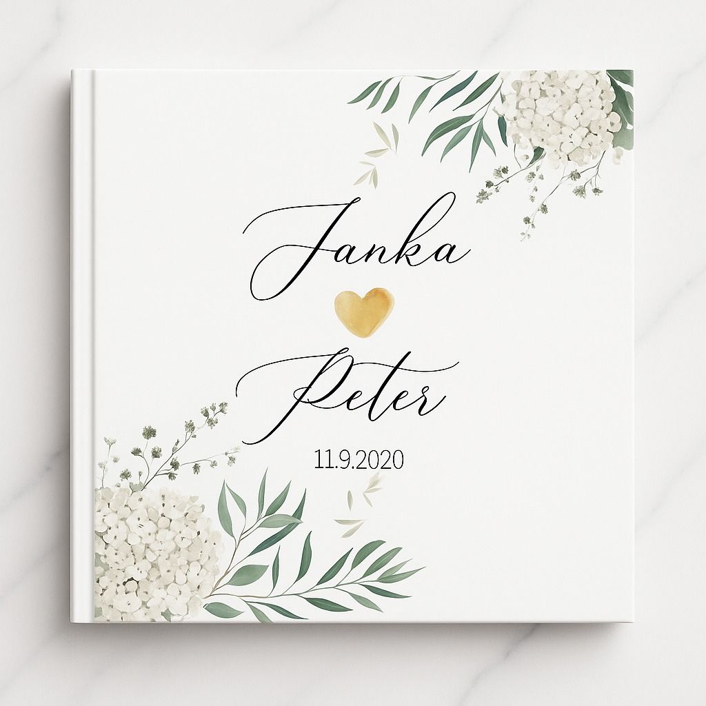 Jemná svadobná kniha hostí s pevným obalom a s vlastným textom. Na knihu hostí je možné napísať ľubovoľný text, napríklad mená, dátum svadby, slová svadobná kniha a iné.