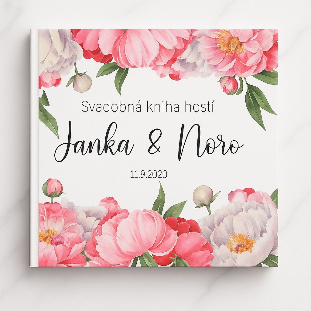 Jemná svadobná kniha hostí s pevným obalom a s vlastným textom. Na knihu hostí je možné napísať ľubovoľný text, napríklad mená, dátum svadby, slová svadobná kniha a iné.