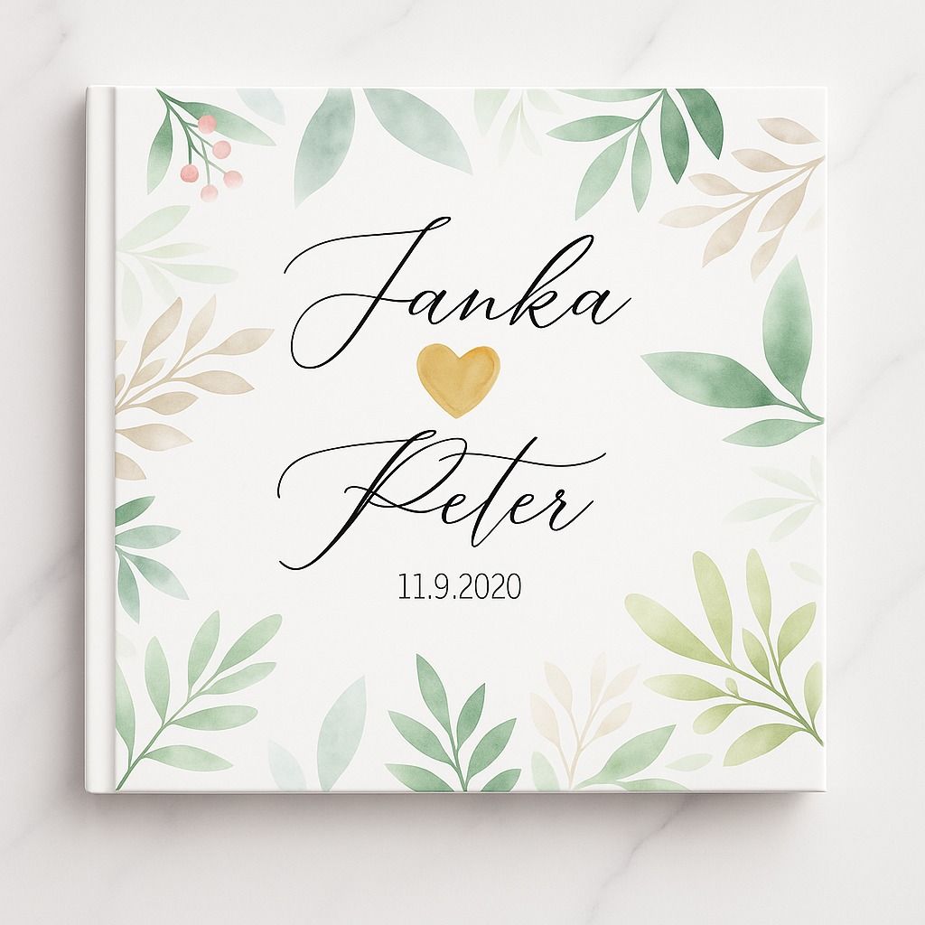 Jemná svadobná kniha hostí s pevným obalom a s vlastným textom. Na knihu hostí je možné napísať ľubovoľný text, napríklad mená, dátum svadby, slová svadobná kniha a iné.