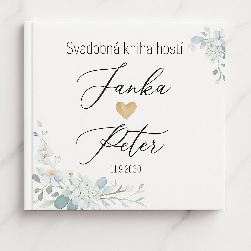 Jemná svadobná kniha hostí s pevným obalom a s vlastným textom. Na knihu hostí je možné napísať ľubovoľný text, napríklad mená, dátum svadby, slová svadobná kniha a iné.