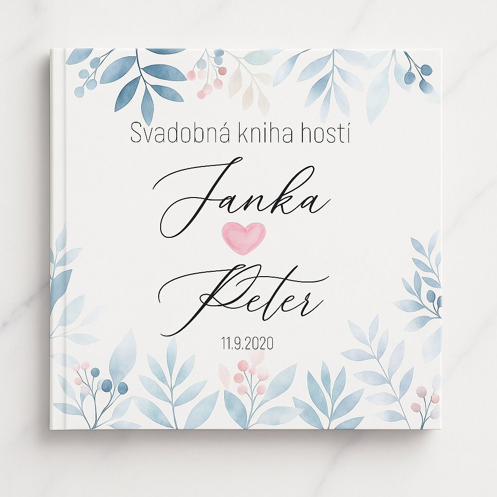 Jemná svadobná kniha hostí s pevným obalom a s vlastným textom. Na knihu hostí je možné napísať ľubovoľný text, napríklad mená, dátum svadby, slová svadobná kniha a iné.