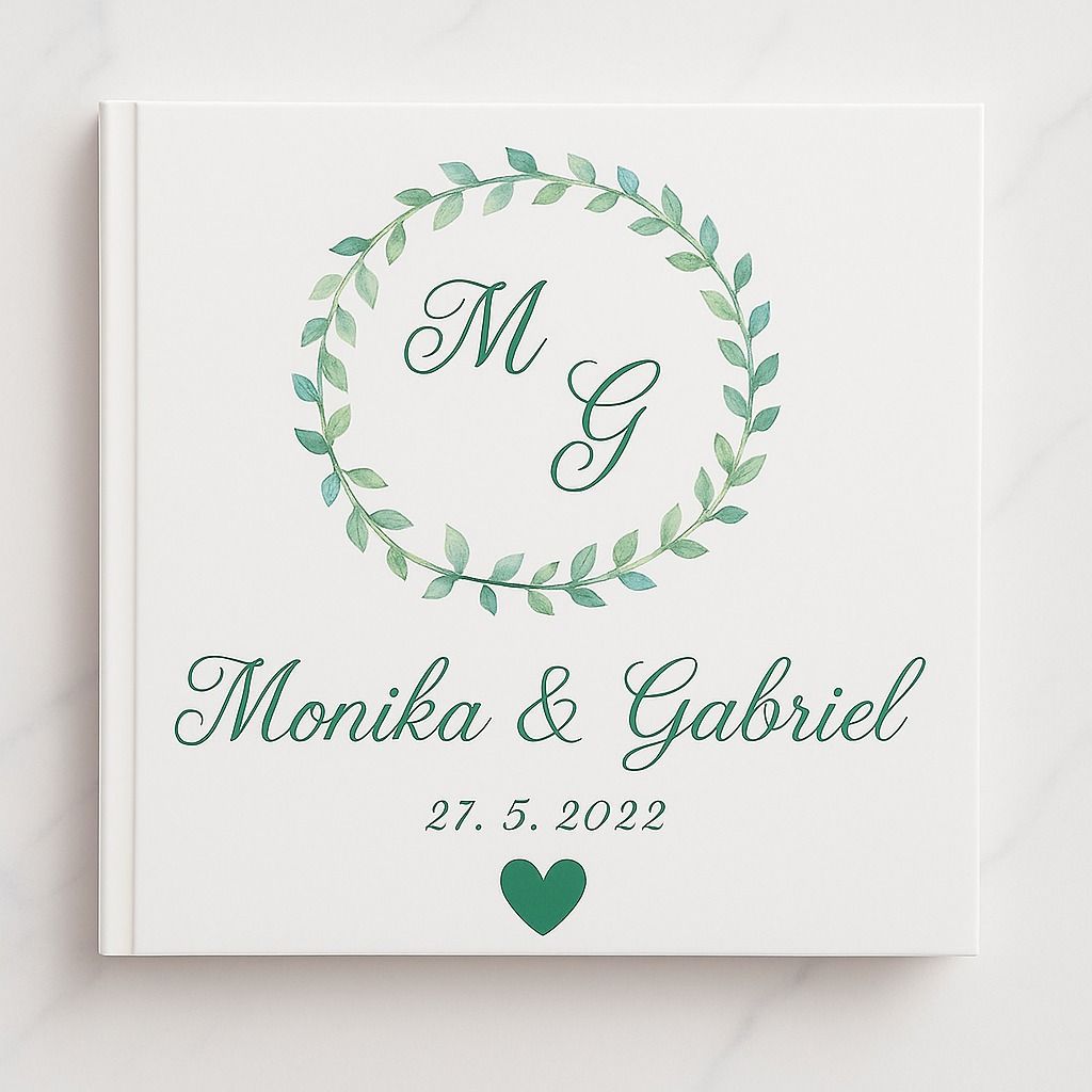 Jemná svadobná kniha hostí s pevným obalom a s vlastným textom. Na knihu hostí je možné napísať ľubovoľný text, napríklad mená, dátum svadby, slová svadobná kniha a iné.