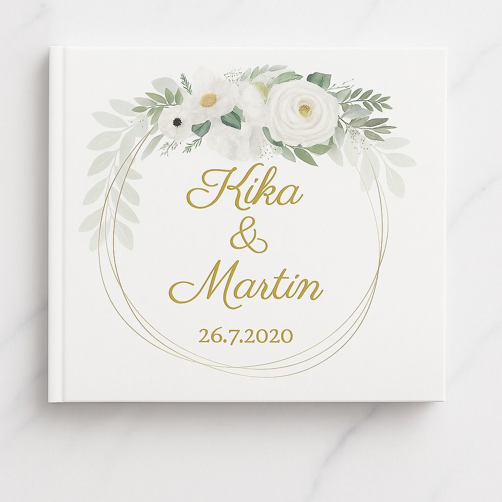 Jemná svadobná kniha hostí s pevným obalom a s vlastným textom. Na knihu hostí je možné napísať ľubovoľný text, napríklad mená, dátum svadby, slová svadobná kniha a iné.