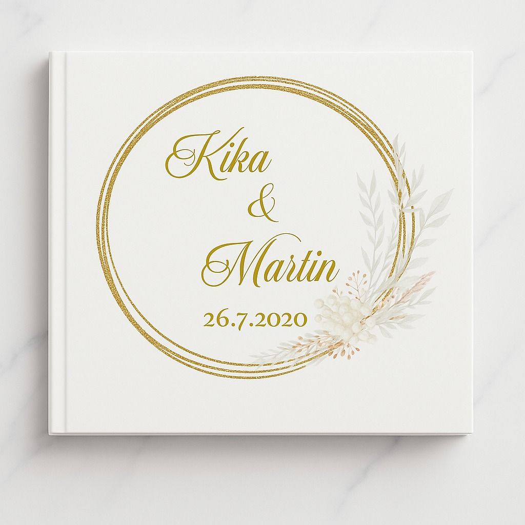 Jemná svadobná kniha hostí s pevným obalom a s vlastným textom. Na knihu hostí je možné napísať ľubovoľný text, napríklad mená, dátum svadby, slová svadobná kniha a iné.
