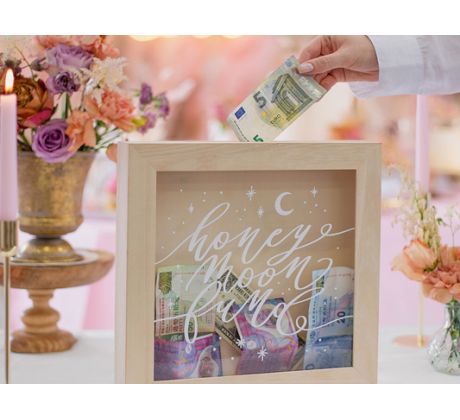 Drevená krabička na peniaze s nápisom Honeymoon.
