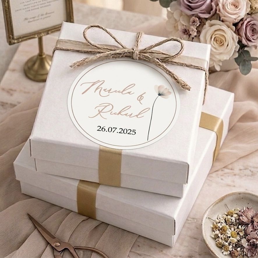 Dodajte vašim svadobným výslužkám a darčekom pre hostí finálnu bodku s našimi personalizovanými nálepkami. Tieto samolepiace nálepky s vašimi menami a dátumom svadby premenia každú krabicu s koláčmi, či drobnú pozornosť na štýlový a osobný darček. Naše nálepky sú výsledkom vlastnej precíznej výroby, vyznačujú sa sýtymi farbami a kvalitným lepidlom, ktoré spoľahlivo drží na papieri aj skle. Vytvorte si jedinečné svadobné poďakovanie, ktoré dokonale zladíte s vašou výzdobou a ktoré vašim hosťom pripomenie vašu lásku pri každom pohľade na výslužku.