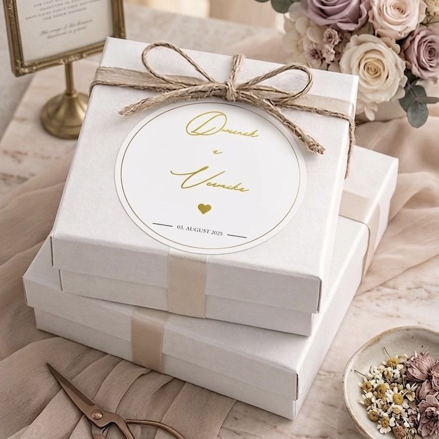 Dodajte vašim svadobným výslužkám a darčekom pre hostí finálnu bodku s našimi personalizovanými nálepkami. Tieto samolepiace nálepky s vašimi menami a dátumom svadby premenia každú krabicu s koláčmi, či drobnú pozornosť na štýlový a osobný darček. Naše nálepky sú výsledkom vlastnej precíznej výroby, vyznačujú sa sýtymi farbami a kvalitným lepidlom, ktoré spoľahlivo drží na papieri aj skle. Vytvorte si jedinečné svadobné poďakovanie, ktoré dokonale zladíte s vašou výzdobou a ktoré vašim hosťom pripomenie vašu lásku pri každom pohľade na výslužku.