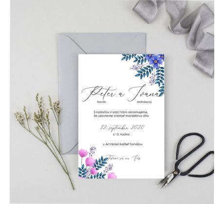 Krásne svadobné oznámenie v elegantnom prevedení s kvetmi. Oznámenie vytlačíme s ľubovoľným textom. Písmo a aj text je možné upraviť podľa požiadavky.