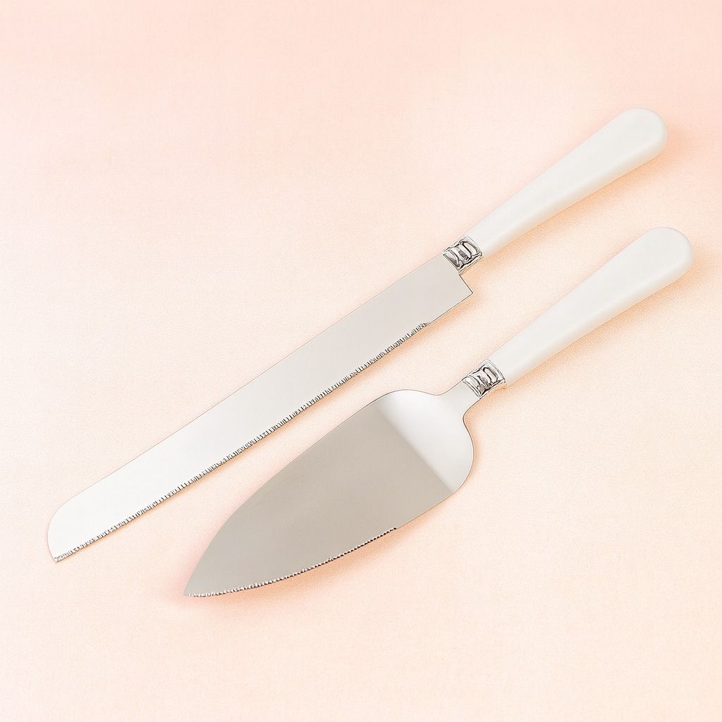 Elegantná sada na krájanie svadobnej torty. Svadobný set na tortu sa skladá z 30cm noža a 24,5cm lopatky. Sada na tortu má rúčky v prírodnej bielej perleťovej farbe. Set na svadobnú tortu má čepele v striebornom kovovom prevedení. Set na krájanie torty dodávame v praktickom balení v krabičke.
