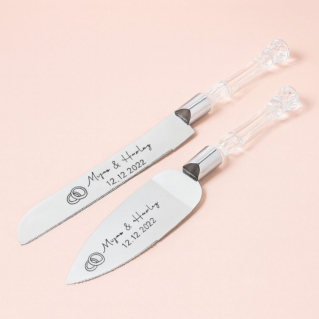 Set príboru na svadobnú tortu s personalizovaným textom je skvelým darčekom alebo spomienkou na svadobný deň.