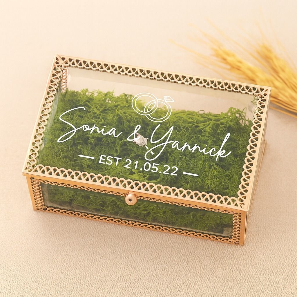 Krásny elegantný box na snubné prstene s menami nevesty a ženícha a dátumom svadby. Box je vyrobený zo skla a kovu. Naplnený je machom.