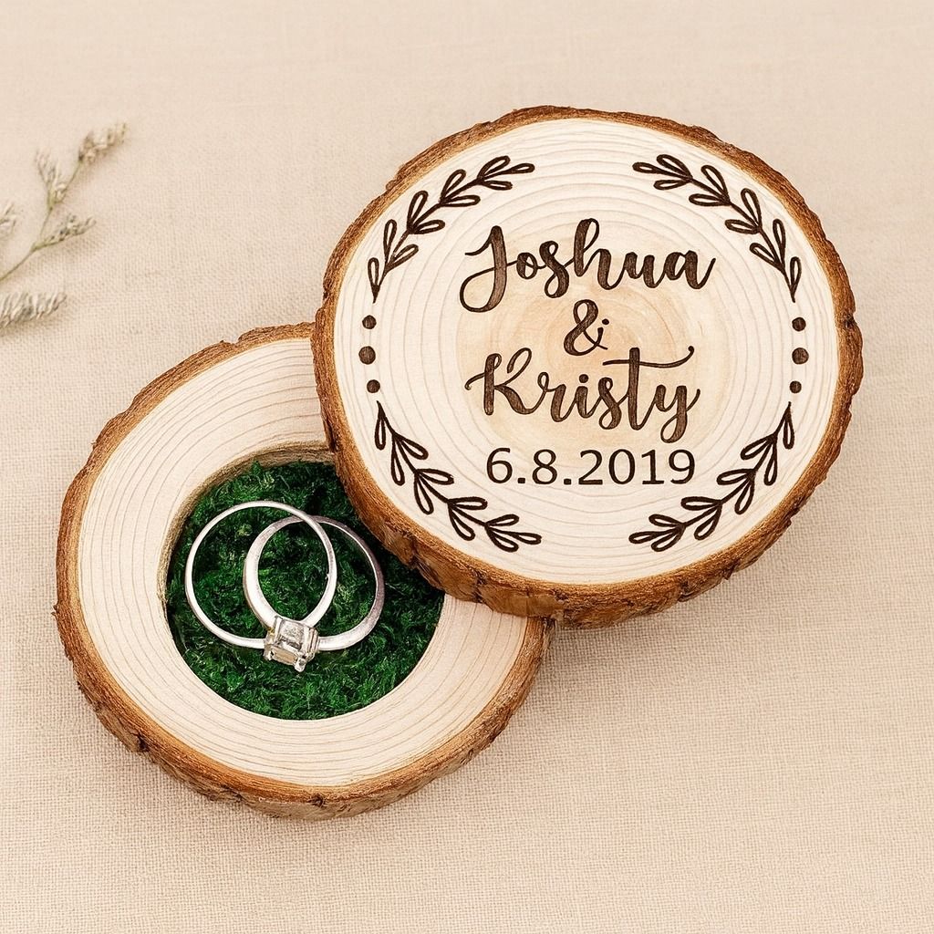 Drevená krabička na obrúčky v tvare pníka. Krabička sa skladá z 2 častí a do vnútra sa vkladajú obrúčky.