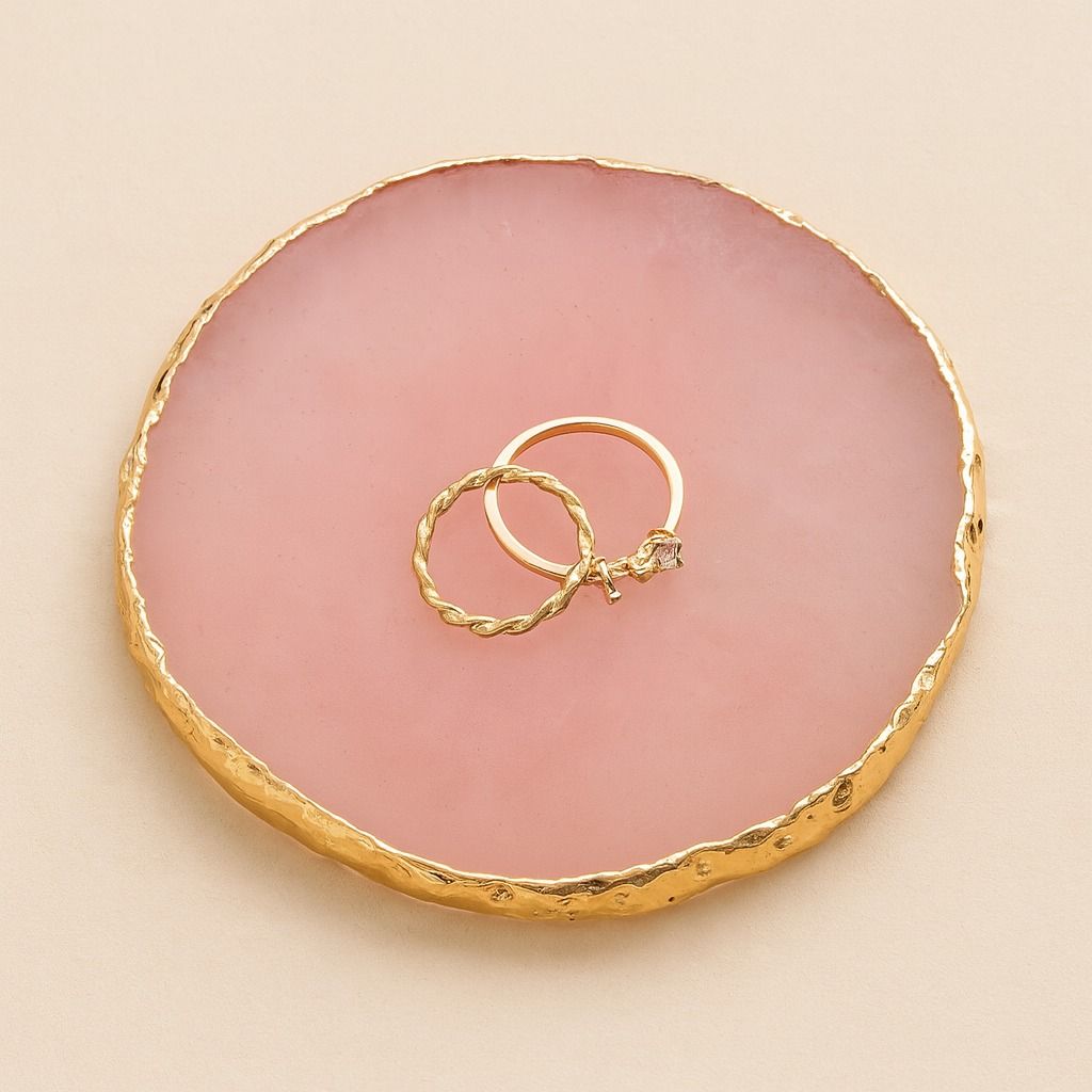 Tácka na svadobné obrúčky zo živica v ružovej farbe so zlatým lemom.