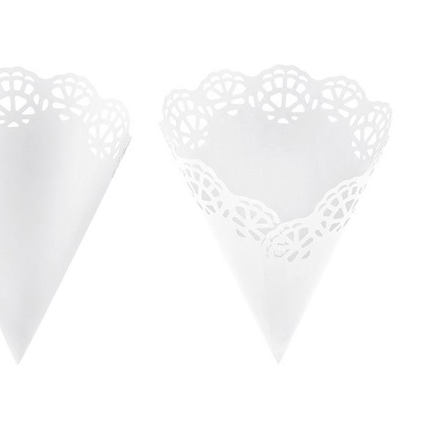Papierový kornútok na ryžu, konfety či lupienky ruží je vyrovený z matného papiera. V hornej časti vyrazenú čipku. Svadobné papierové kornútky majú po poskladaní výšku 20cm. Dodávame neposkladané.