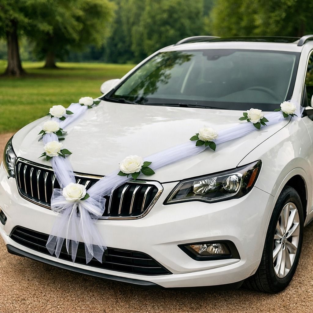 Jednoduchá biela výzdoba na svadobné auto! Girlanda je vyrobená z bielej organzy a bielych ruží s lístkami.